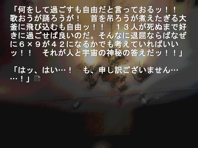 金蔵が、6×9=42それこそ人と宇宙の神秘の答えだと言っているシーン。